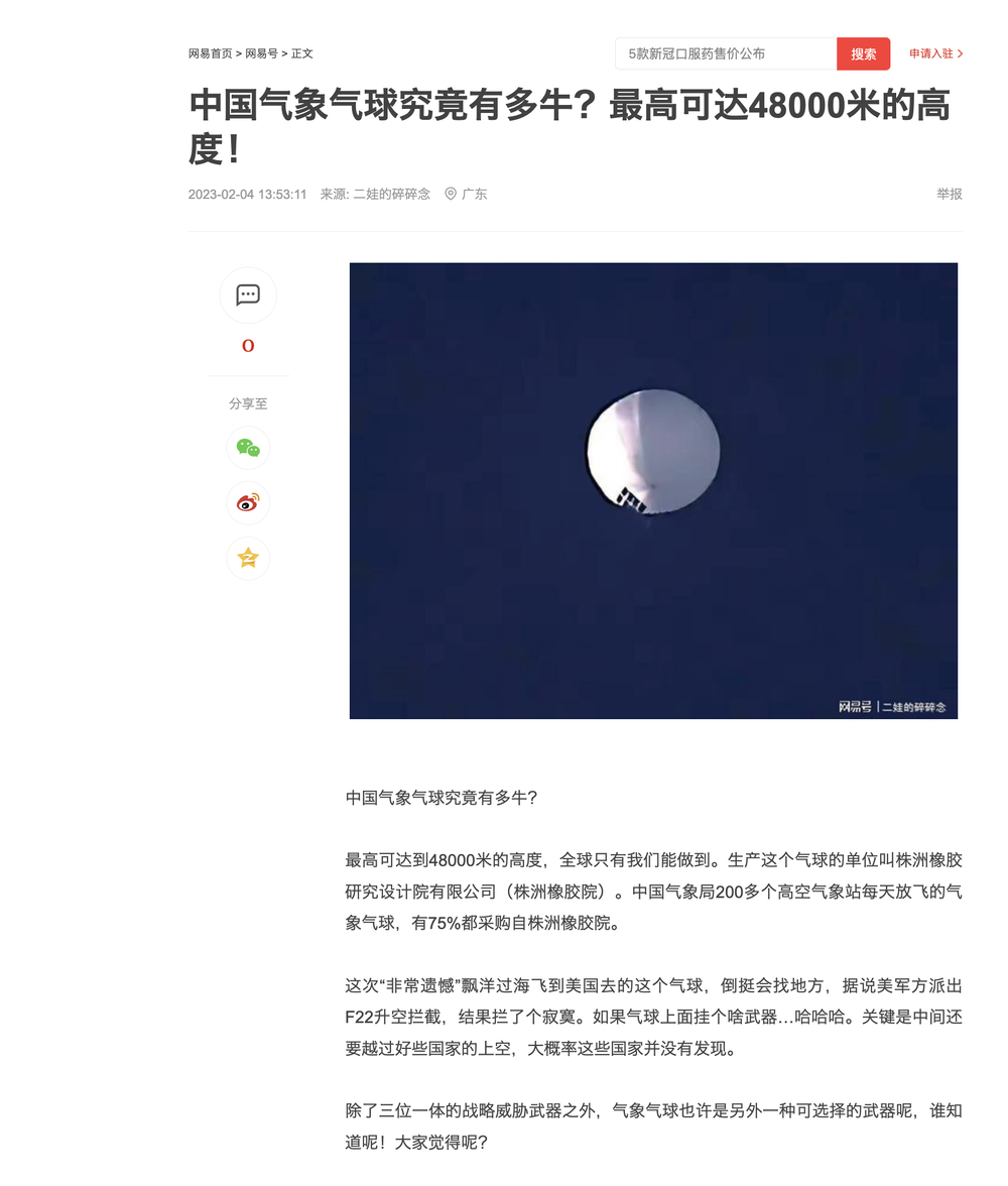 The producer of the Chinese spy balloons, China Zhuzhou Rubber Research & Design Institute Co Ltd. (中国化工株洲橡胶研究设计院有限公司), is a government-owned military research institute with weapon production licenses. Its military supporting products were used in the “Shenzhou V” manned spacecraft, and have won the PLA General Armament Department commendation. It is a designated research institution for the weather balloons of all military branches of the PLA, and the only professional research institute in the latex industry.